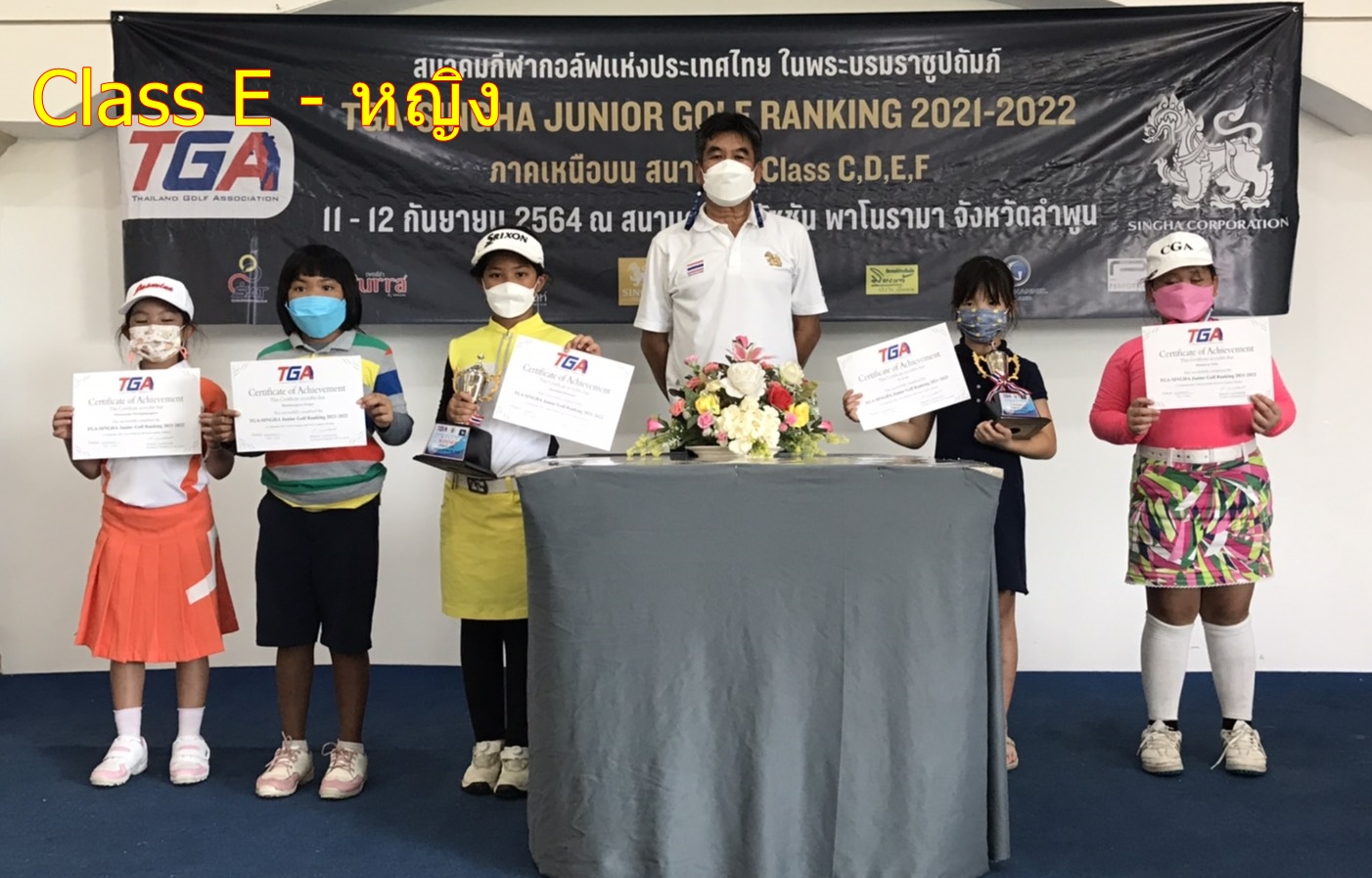 Class E (อายุ 7-8 ปี) ประเภทชาย อันดับที่ 1 นพวุฒิ ดอยด่วน 85-82 รวม 23 โอเวอร์พาร์ 167 อันดับที่ 2 Kiyonari Shintani 87-86 รวม 29 โอเวอร์พาร์ 173 อันดับที่ 3 กัณภัส วรเศรษฐกร 86-87 รวม 29 โอเวอร์พาร์ 173 อันดับที่ 4 ธาม สรชาติ 91-87 รวม 34 โอเวอร์พาร์ 178 อันดับที่ 5 ชัยพัฒน์ วงศ์เปี่ยมโชค 99-96 รวม 51 โอเวอร์พาร์ 195 ประเภทหญิง อันดับที่ 1 สร้อยสามจันทร์ จันทราทิตย์ 82-89 รวม 27 โอเวอร์พาร์ 171 อันดับที่ 2 Yi Ni Cai 89-90 รวม 35 โอเวอร์พาร์ 179 อันดับที่ 3 ปานตะวัน ปาลี 99-99 รวม 54 โอเอร์พาร์ 198 อันดับที่ 4 แพรววานิช วรอภิญญาพร 106-101 รวม 63 โอเวอร์พาร์ 07 อันดับที่ 5 วัชราภรณ์ ศิริยศ 110-106 รวม 68 โอเวอร์พาร์ 212
