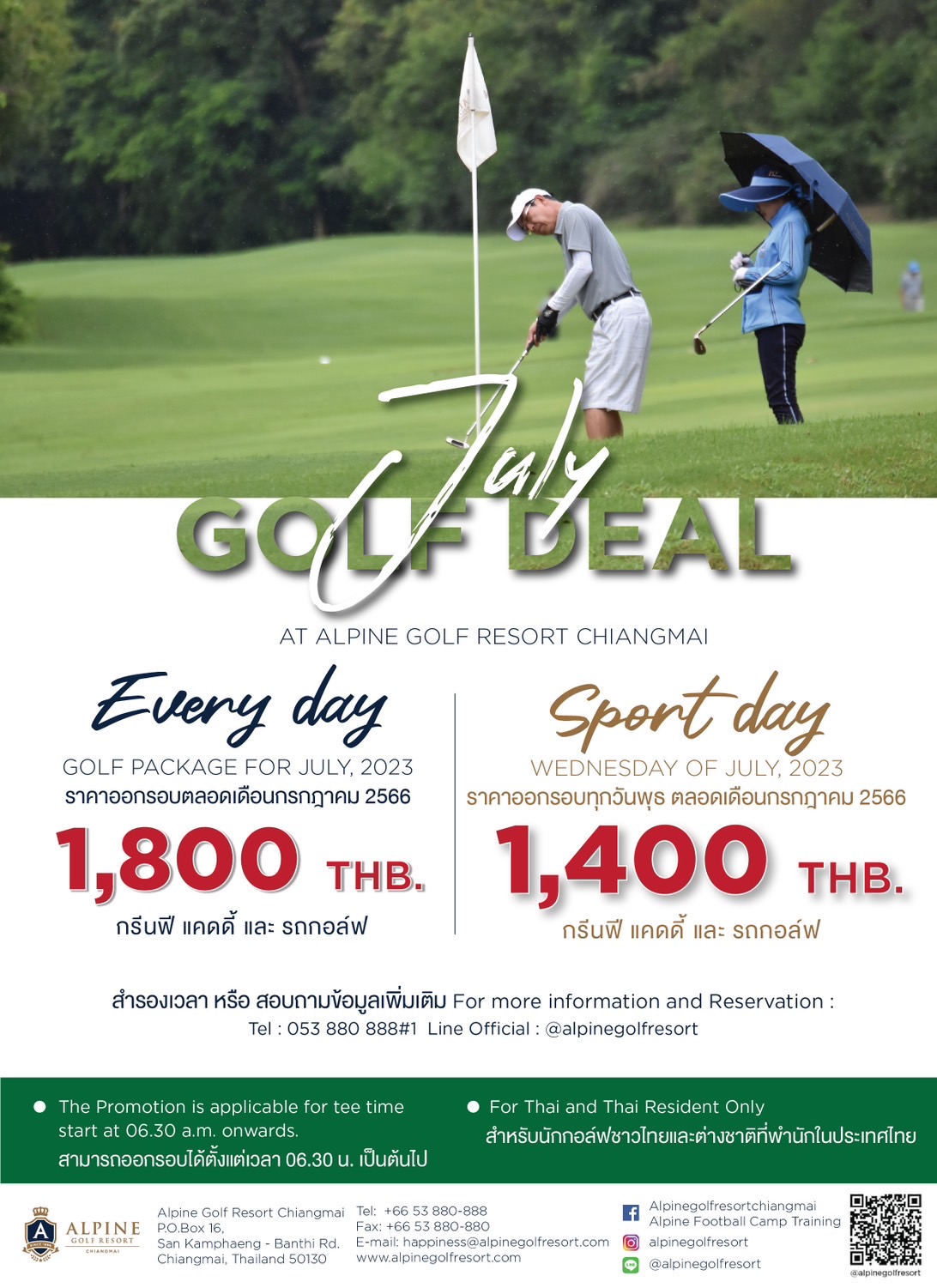 ต่อที่โปรโมชั่นพิเศษ สปอร์ตเดย์ ทุกวันพุธ ออกรอบเล่นกอล์ฟได้ในราคาเพียง 1,000 บาท รวมกรีนฟี แคดดี้ และรถกอล์ฟนั่งเดี่ยว สามารถใช้ได้ระยะยาว 2 เดือน ตั้งแต่วันที่ 1 กรกฎาคม - 31 สิงหาคม 2566